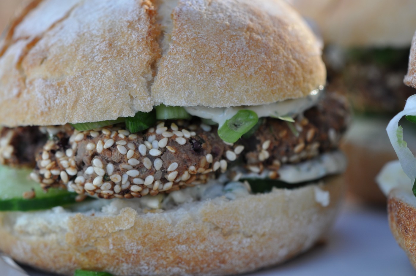- Z fazolové hmoty tvoříme Burgery. Uděláme si kuličku, tu rozplácneme a obalíme v sezamu. Dáme na gril a grilujeme po každé straně asi 5 minut.
