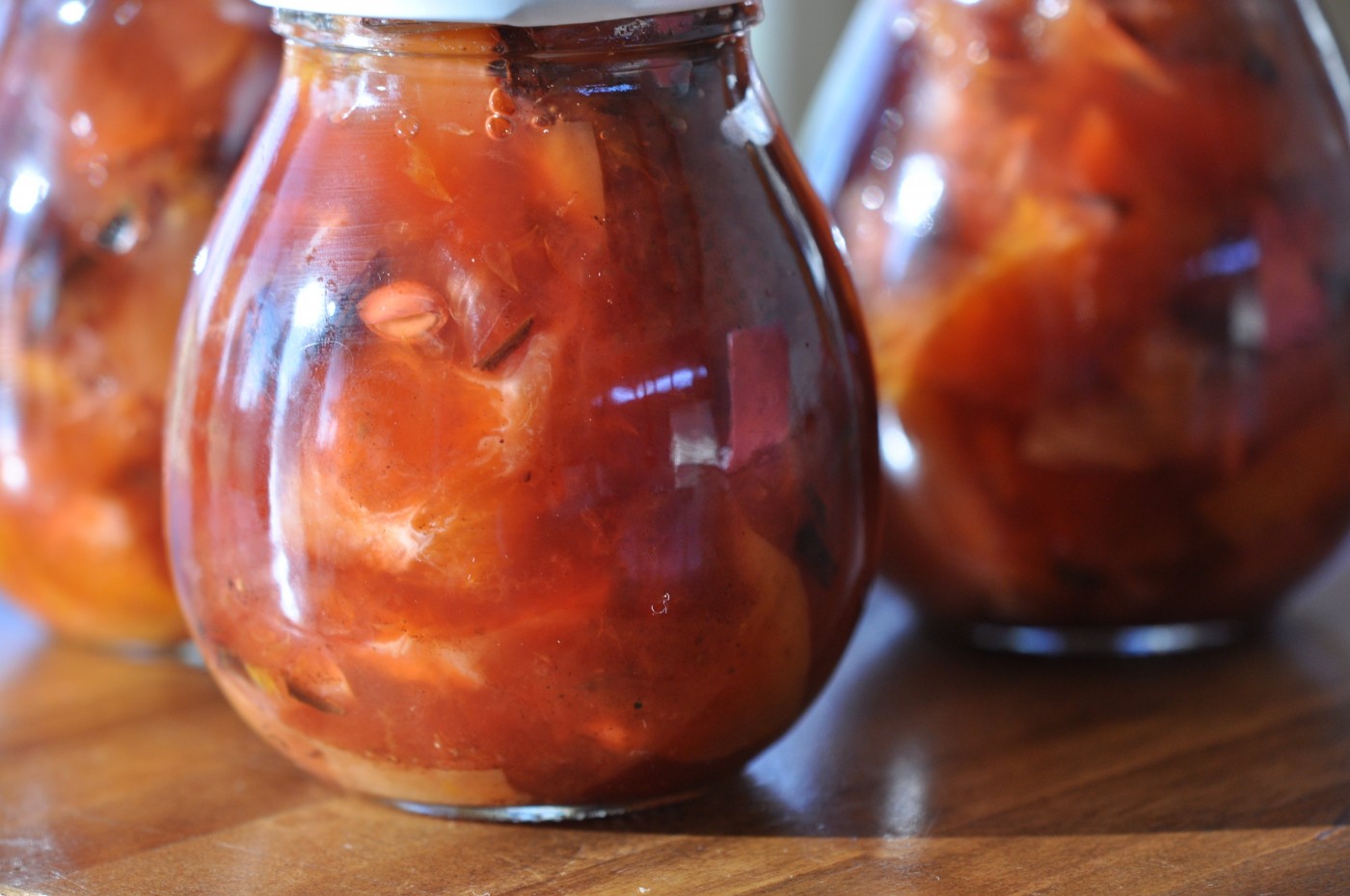 Ovoce omyjeme, očistíme, zbavíme kůry a jádřinců. Nakrájíme na kousky asi 2×1 cm. Dáme do pekáče, přidáme koření, které jsme si rozdrobili nebo zpracovali v hmoždíři. Zasypeme cukrem. Dáme do trouby vyhřáté na 200 °C a pečeme asi 1 hodinu. Občas promícháme. Připravíme si sklenice (malé zavařovačky s víčkem), které důkladně vymyjeme – ideálně v myčce. Necháme vyschnout. Pečený čaj nalijeme do sklenic, zavíčkujeme a obrátíme dnem vzhůru. Necháme vystydnout. Pečený čaj dáme do hrníčků (2 lžičky na 2dl) a zalijeme vřelou vodou. Ovoce měníme dle sezóny a chuti.